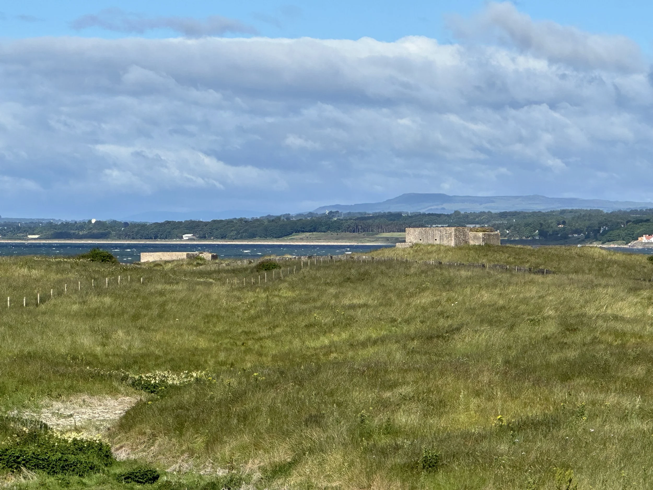 Whitecaps show how windy it was that day with a pair of World War II bunkers on the coastline.