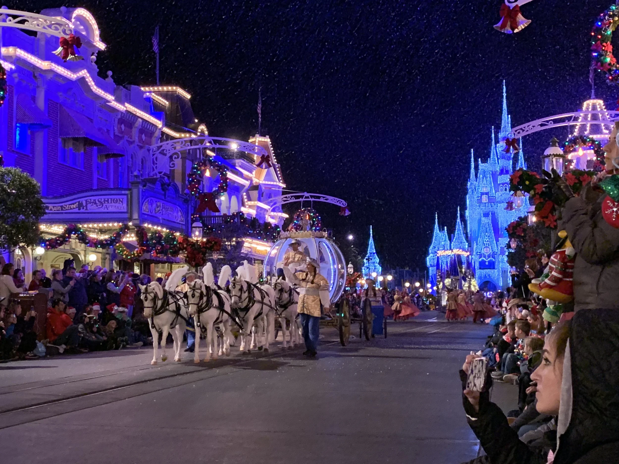 One of the coolest parts of the party is that it “snows” on Main Street. They are little flakes that are rumored to be made out of soap. Soap or not, it certainly looks amazing. It comes in bursts throughout the night and seemed constant during the parade. Nothing quite puts you in the holiday spirit better than enjoying a warm drink on Main Street while snow is falling and Christmas music plays, it is pure magic!