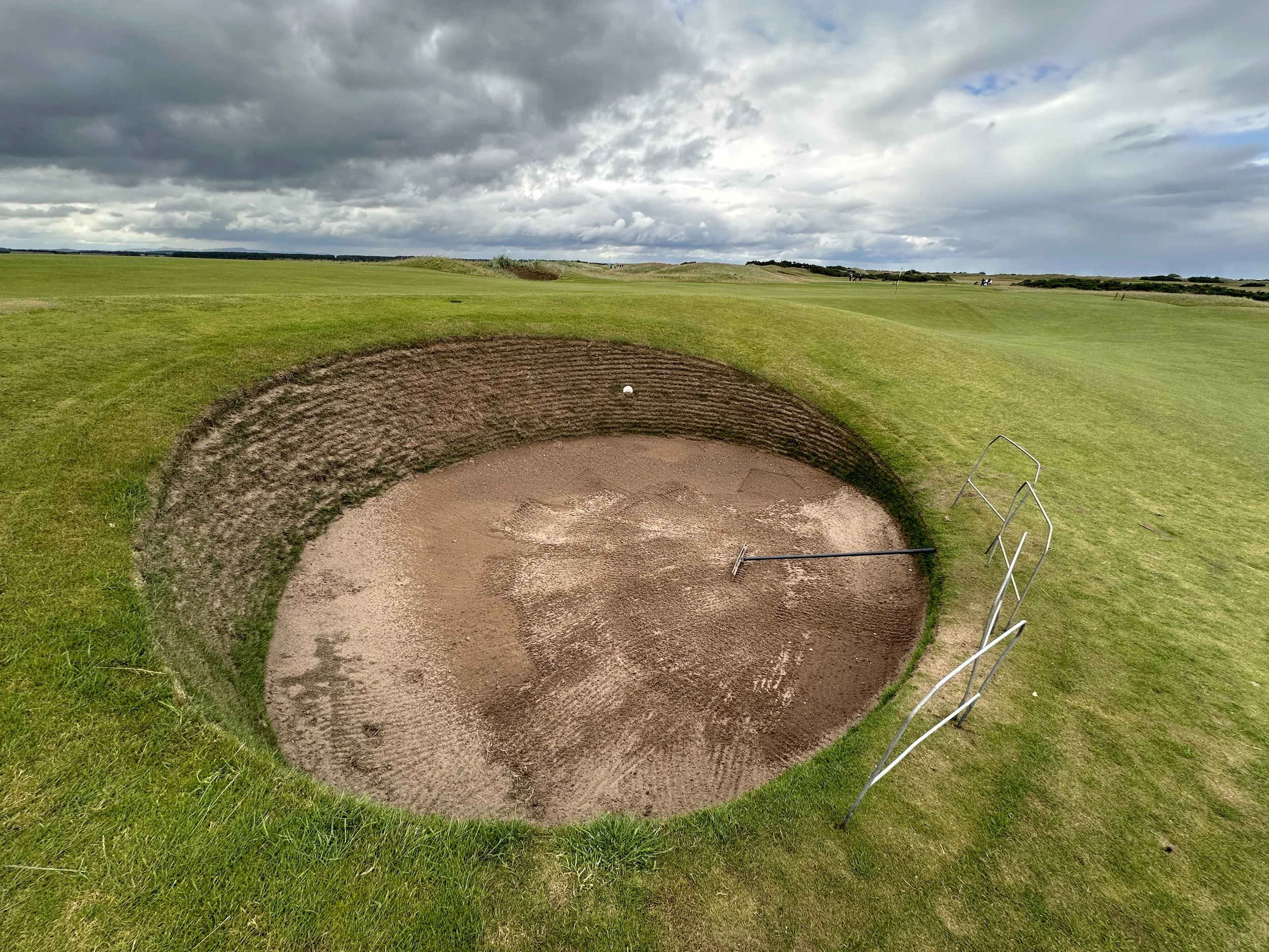 Andrew got his first taste of an Old Course bunker on the second hole in the right front green side pot bunker. Even though he was close enough to the wall that he had to play out towards the front of the green, the lasting image was seeing a plastic cap right in front of him that plugs up the hole where a camera would be placed during the week of the Open Championship. We saw quite a few of these throughout the round.