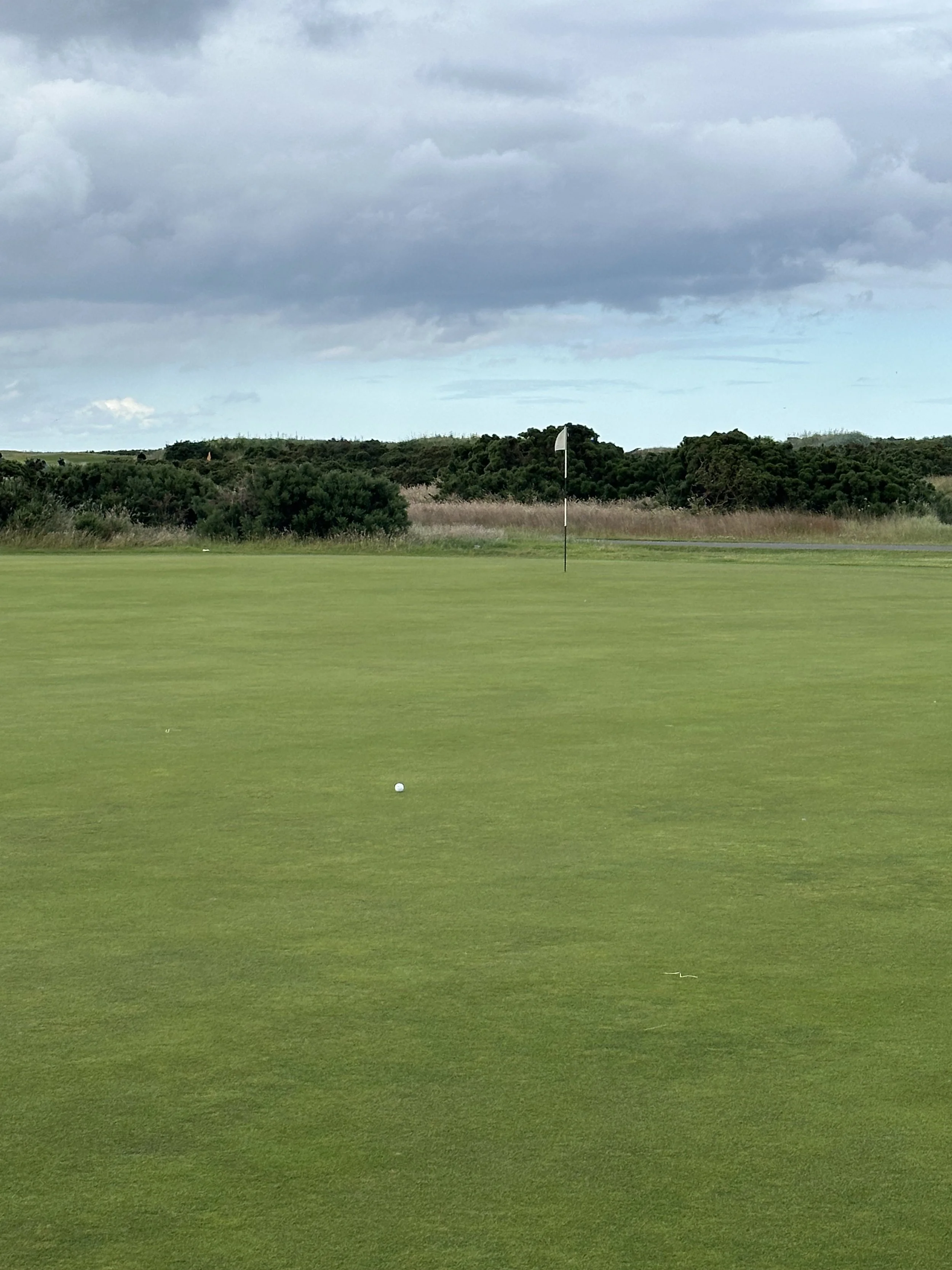 One of the first big surprises is how big the double greens are. The first one we came to was the 2nd and 16th. Can’t remember which green this was but one of them is over 100 yards from front to back. Also, remember that white flags are on the front nine and red for the back nine. We bring this up because it led to a funny exchange with his caddie as the ball was in the air, he asked Andrew if “he pulled it.” Puzzled, Andrew said “no, why?” He soon found out why. Andrew was just right of the fairway on 4 and he hit what he thought was a great shot to about 10 feet but it turned out to result in a nearly impossible putt from about 90 feet.