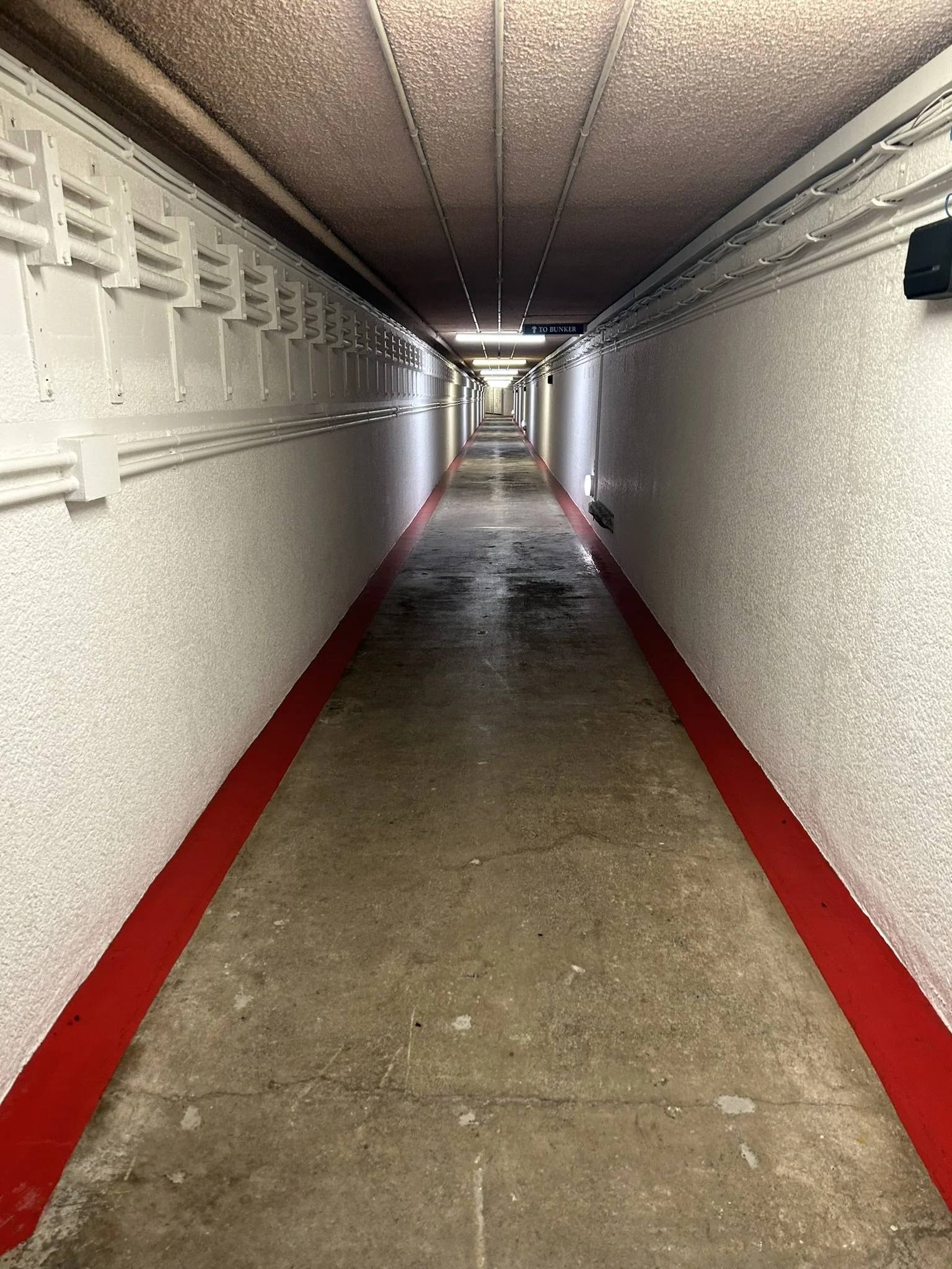 Once we reached the bottom of the stairs, we arrived at the entrance tunnel, which is 450 feet long and gradually slopes down to the top floor of the bunker, which is nearly 100 feet below ground level. Because the bunker is so far underground, it has numerous air intakes and extractors which maintain the temperature at 18 degrees celsius. We found the bunker temperature to be comfortable.