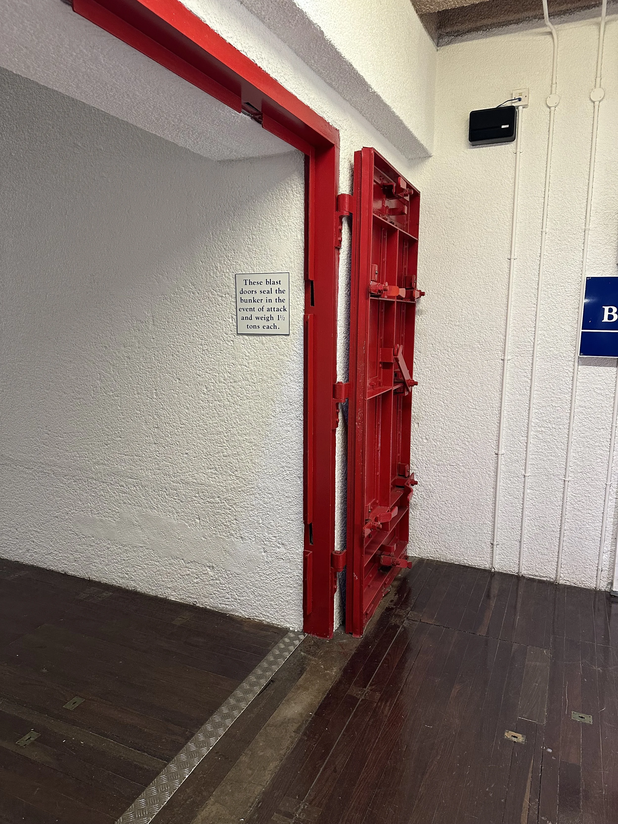At the entrance to the operating area of the bunker, we were met with a sign that stated the bunker from this point on was encased in 15 feet of reinforced concrete. The entrance was also guarded by a large blast door meant to protect the bunker occupants in the event of a nuclear strike.