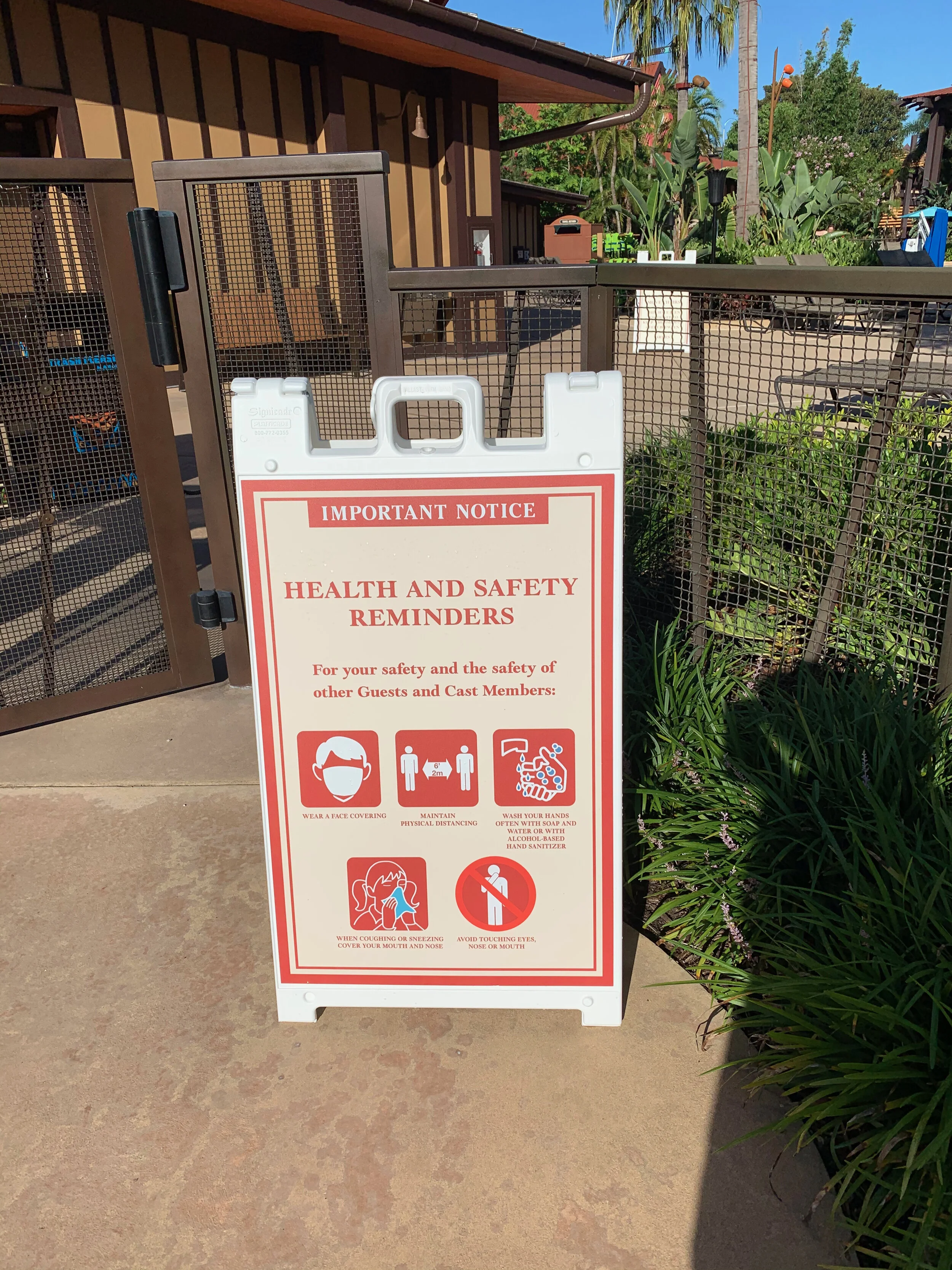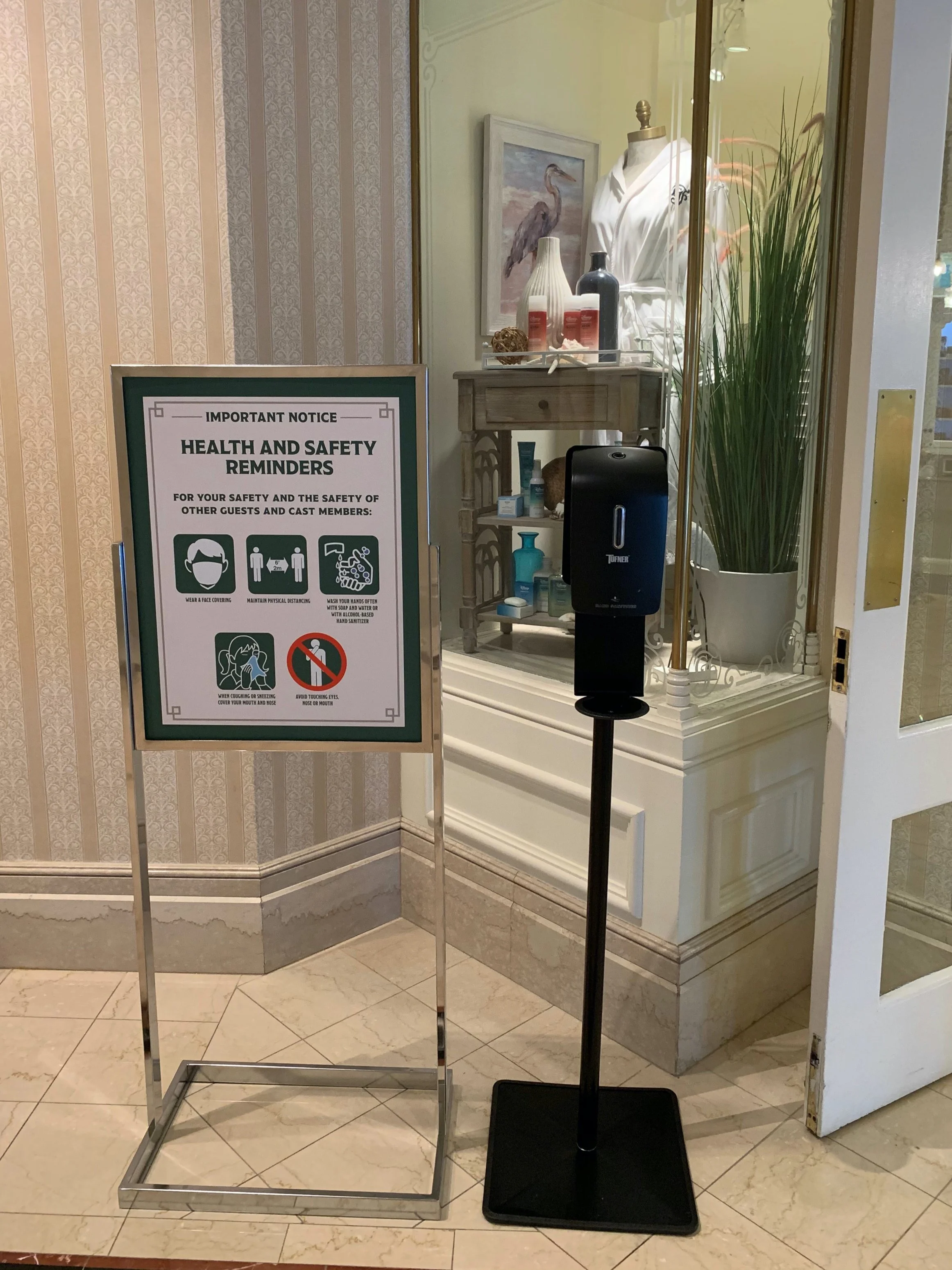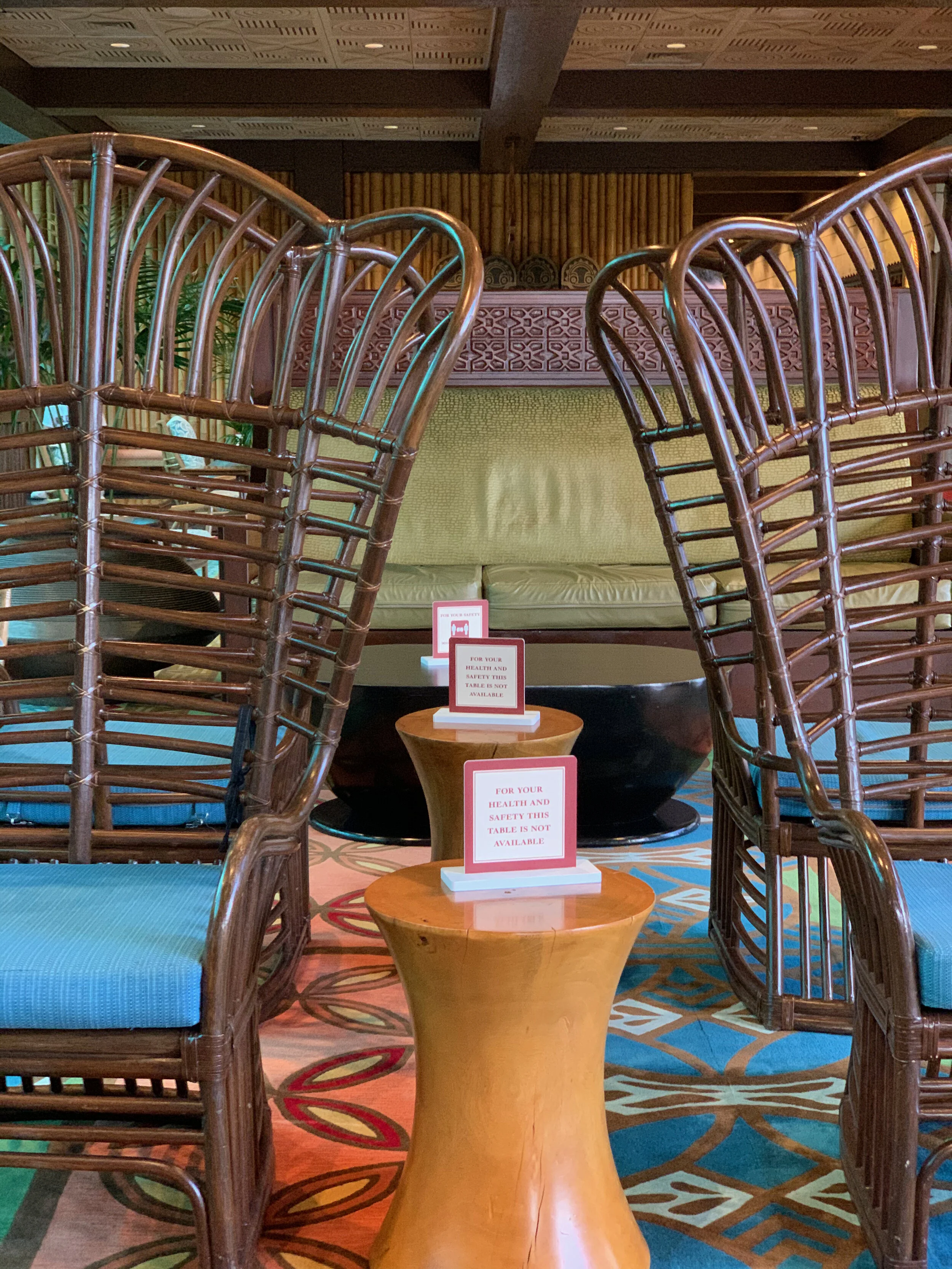 Just like the parks, guests and cast members are required to wear masks when in the resort. (This also includes walking between buildings.) The first thing we noticed was how quiet the lobbies were. The Grand Floridian was especially quiet as we noticed the lobby music wasn’t even playing. While we were at these resorts it is good to note that the Disney Vacation Club rooms were the only ones occupied, so it may become busier as regular resort guests start occupying rooms as well. The lobby areas are definitely missing the normal energy and buzz from guests about but one positive is there are no lines and it is very easy to find a seat! Speaking of seats many areas had added signs to the tables to not use them. There are also plenty of signs around reminding guests of the face mask requirement, to wash your hands, and to social distance. They also have hand sanitizer stations throughout the resorts. It’s good to point out that certain dining locations or shops may be closed at this time. We also recommend to pay attention to signage. Places like shops have specific entry and exit points and may only allow so many quests in at a time.