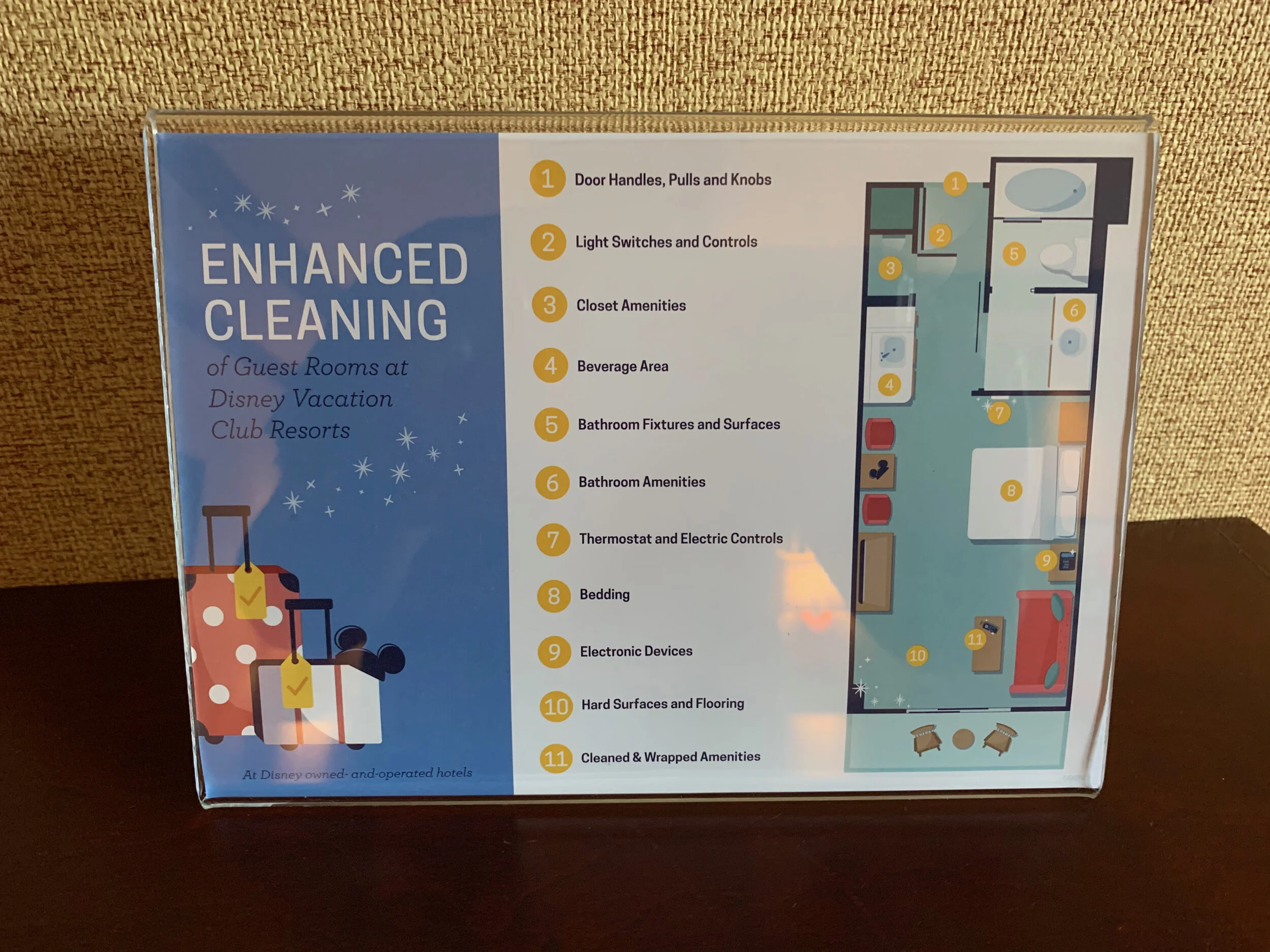It seems that guest rooms must be going through various extra steps at this point in time. While normal check-in should happen by 4pm it seems these times are trending later, our room was ready at around 5pm. There is extra care to clean touch points and there is a sign in the room detailing the extra attention points (see below). We noticed some items such as remotes and soap pumps in some resorts are cleaned and covered with clear bags with “clean” stickers. We also think some items have been removed from the room. Most DVC rooms we stay in feature a decorative runner on the foot of the bed and throw pillows and during this stay we noticed the lack of those items. While the room is a little more plain it probably makes it easier to not have to worry about those items.