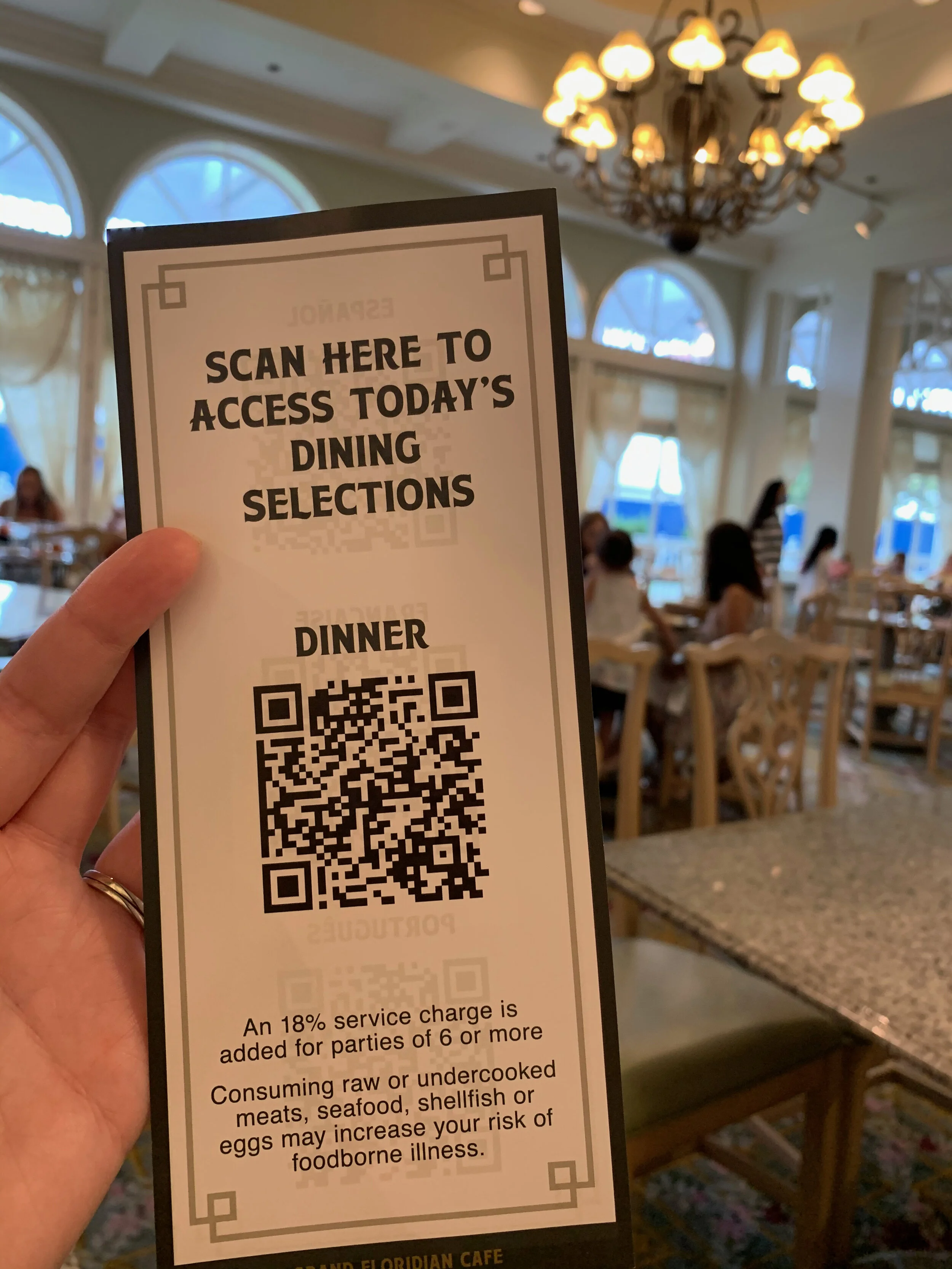 Digital Menu: Servers provide a card with a QR code on it. Once scanned, it brings up the menu on the Disney website. Guests can also get to the menu through the My Disney Experience app.